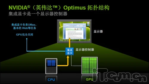 NVIDIA Optimus技术,说白了就是一种双显卡智能切换技术。按照NVIDIA的说法就是:“Optimus技术适用于搭载NVIDIA GPU的笔记本,它对用户是无缝和透明的。它的目的是优化移动体验,让用户获得笔记本独立显卡的高性能,同时仍保持出色的电池续航时间。”“考虑到Intel全新的32nm Arrandale移动处理器自带了图形核心,因此Optimus更像是NVIDIA对此的一种优化技术,能让笔记本用户同时利用处理器集成显卡和NVIDIA独立显卡,从而维持自己在移动领域的市场地位。”
