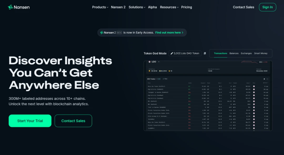 Nansen 是一个区块链分析平台,可通过数百万个钱包标签丰富链上数据。该平台目前支持如 Ethereum、Polygon、BNB Chain、Avalanche 等多条主流区块链,用户可以通过他们自己的区块链调查更深入地了解链上实际发生的事情,并帮助用户做出更明智的决定。Nansen 的一个关键优势是它的 Smart Money 标签,它允许用户密切关注该领域的聪明钱们正在做什么。