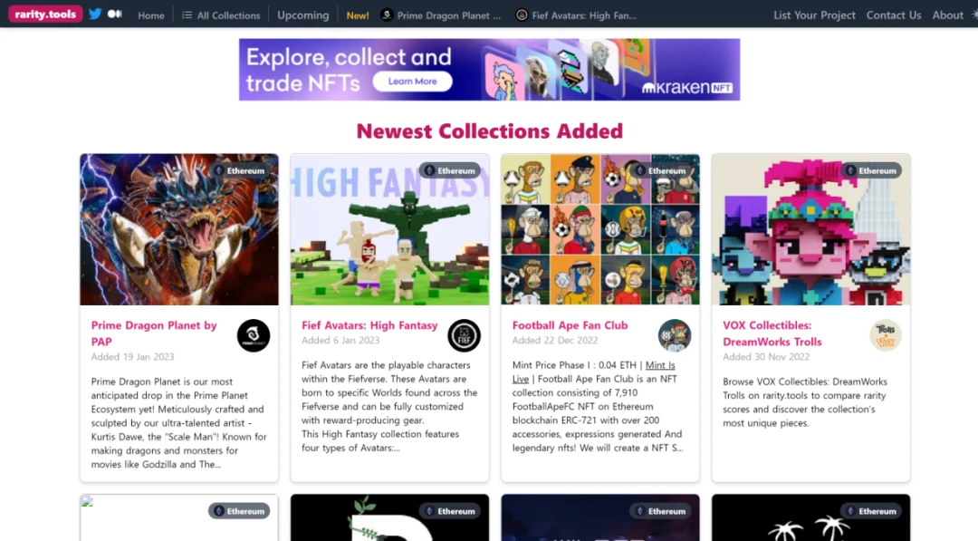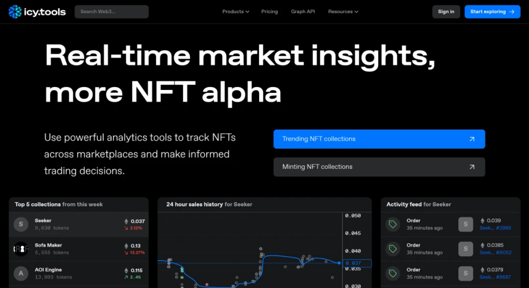 Icy.Tools 是一个 NFT 跟踪平台,在这里用户可以查看 NFT 的最新底价、数量和销售历史。用户也可以在这里发现正在 mint 的新项目并跟踪投资组合。它还具有有用的发现功能,如查看收藏趋势,7 天销量和最低价格。