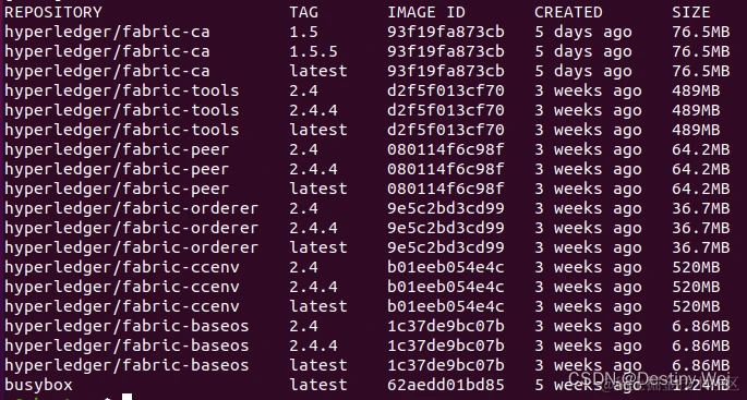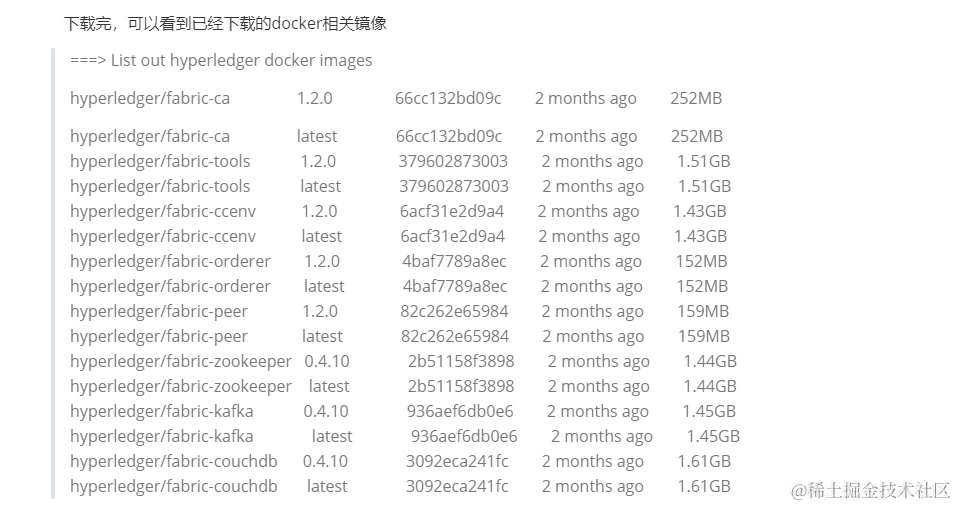 docker pull hyperledger/fabric-ca:版本 docker pull hyperledger/fabric-orderer:版本 docker pull hyperledger/fabric-peer:版本 docker pull hyperledger/fabric-ccenv:版本 docker pull hyperledger/fabric-tools:版本 docker pull hyperledger/fabric-baseos:版本 docker pull hyperledger/fabric-kafka:版本 docker pull hyperledger/fabric-zookeeper:版本 docker pull hyperledger/fabric-couchdb:版本注意:这里需要注意上面内容分别给出了1.x版本 2.x版本的镜像 大家按需自取。正常来说按官方文档来的话都是齐全的,个人建议尽量还是不要去看网络文章。