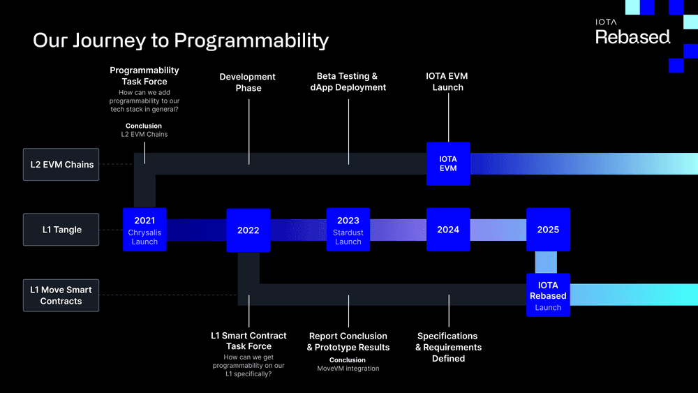 然而,IOTA 基金会在反思了近十年的经验以及行业合作伙伴和构建者不断变化的需求后,认识到有机会加速其核心使命。最初的 IOTA 2.0 路线图虽然承诺完全去中心化和 L1 可编程性,但却是一项多年的研究工作。为了更快、更有效地将这些关键特性推向市场,2024 年末提出了“IOTA Rebased”提案。这是一个战略性的转变:IOTA 将通过集成 Sui 经过实战考验的、强大的 MoveVM 来“rebase” 其 Layer 1,而不是从头开始构建所有内容,从而从根本上加快了完全去中心化的、可编程的主网上线时间。