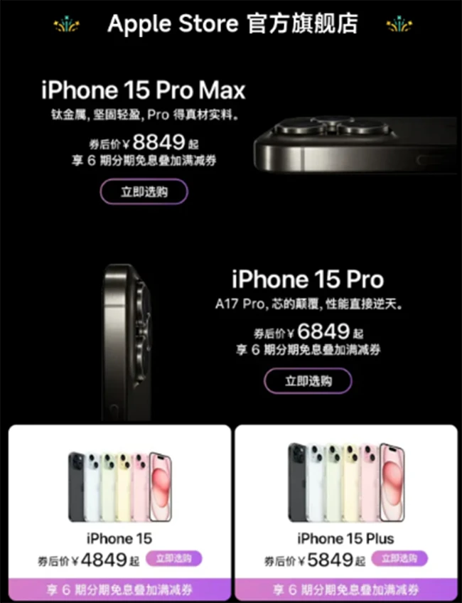 近日,我们发现天猫Apple Store官方旗舰店又开始了降价活动,iPhone 15全新产品均创官方渠道历史最低,其中iPhone 15标准版起售价格为4849元、iPhone 15 Plus起售价格为5849元、iPhone 15 Pro起售价格为6849元、iPhone 15 Pro Max起售价格为8849元。