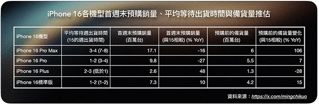 造成上述状况的原因主要来自于两方面,原因之一是主力机型iPhone 16 Pro系列出货时间明显比iPhone 15 Pro系列短,苹果在预购之前增加了备货量。原因之二是消费者购买iPhone 16 Pro系列的需求低于预期。
