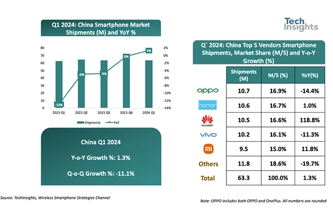 近日,市场研究机构TechInsights发布了2024年一季度中国手机市场的出货数据,显示中国智能手机出货量为6330万台,同比增长1%,终于结束了连续11个季度的年度下滑,说明目前市场正在企稳回升。