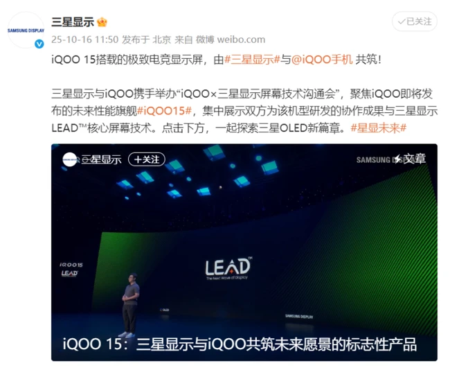 “自 2019 年起,iQOO 与三星显示已达成六年深度协作,始终致力于为用户提供行业顶尖的显示体验。”副总裁李豪重表示,“此次发布的 iQOO 15 搭载 2K 三星珠峰屏,不仅集成三星显示尖端发光材料,更融入三星显示标志性的 LEAD™ 技术,实现屏幕性能的全面突破。”