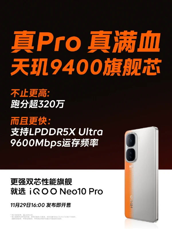 据悉,iQOO Neo10 Pro将采用天玑9400移动平台,是2~3K价位段中首搭这枚3nm天玑平台的机型,是截至目前同档位最强的芯片组。