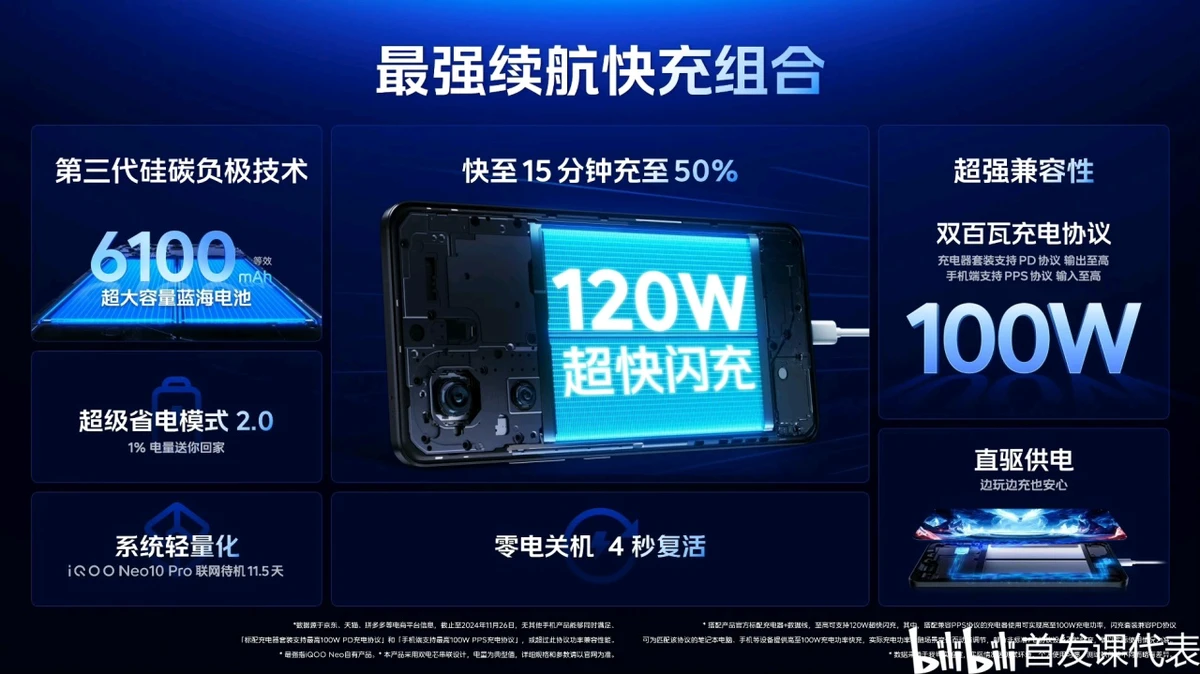 ◆ 电池容量:6100mAh,支持 120W 快充(兼容 100W PPS、100W PD、44W UFCS);