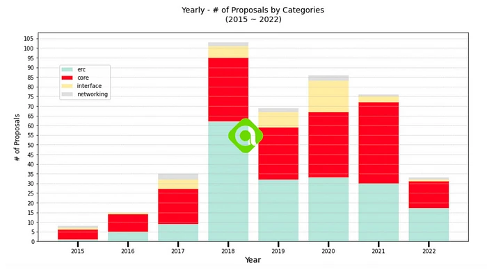 Ethereum 2.0 复杂结构的第一个原因是简化 Ethereum 系统的升级过程。他们通过将其分解为模块化组件来实现这一点。具体来说,Ethereum 的执行层和共识层具有不同的角色。为了更好地理解,请查看下面的图表。它按类别细分了 2015 年至 2022 年 Ethereum 提出的 EIP(Ethereum 改进提案)。
