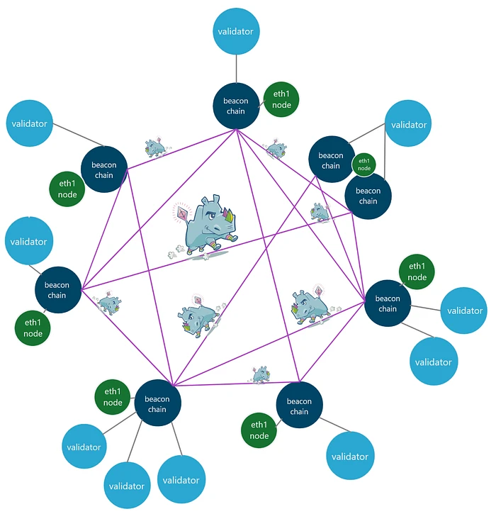 上图是最清晰的整个 Ethereum 网络的表示:每个节点通过信标链(共识客户端)连接,并且该网络由 eth1 节点(执行客户端)和验证者客户端组织,每个客户端都与信标链通信。