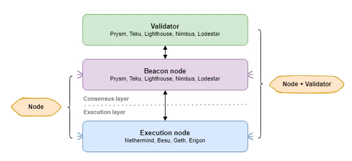 此时,信标节点和验证者客户端属于共识层,而执行节点属于执行层。当我们谈论层时,我们指的不是最近备受关注的 rollups 中的层(L1、L2……)。相反,它们根据其角色进行划分,并作为单独的程序运行。划分这些层的标准是前面讨论的每个 Ethereum 客户端软件所执行的角色,特别是共识和执行。