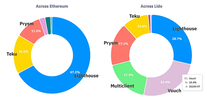 你可以看到,与普通 Ethereum 节点运营商相比,Lido 节点运营商更喜欢使用 Vouch 作为其验证者客户端。Vouch 是一种验证者客户端,专注于允许单个验证者客户端使用不同类型的共识客户端。