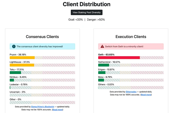 目前,幸运的是,Ethereum 共识客户端不受任何一个客户端的控制。但是,为了使 Ethereum 成为一个更安全的网络,它需要比现在更加多样化其客户端,这意味着它需要努力确保没有客户端控制超过 33%。