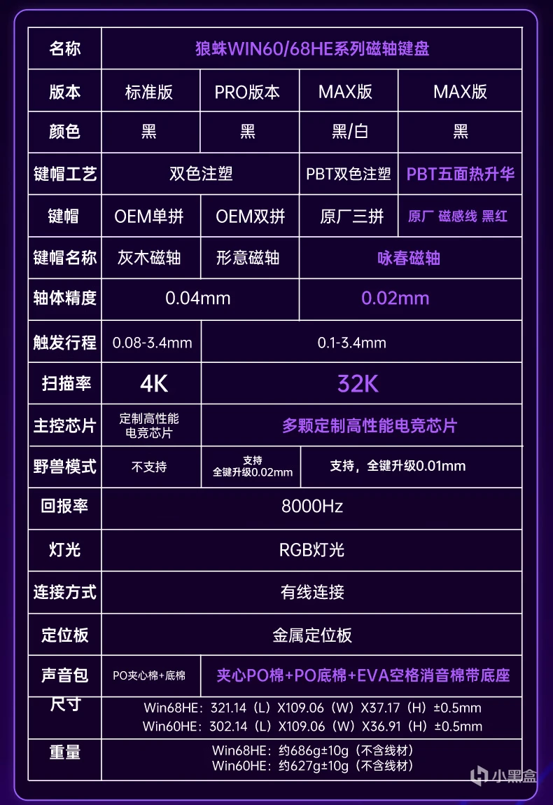 各版本配置如上,顶配Win68HE MAX目前首发价格219元,价差不大的话,就不建议各位入手标准版了,Pro和MAX版都有32K扫描率和定制的高性能电竞芯片,轴体精度更高。