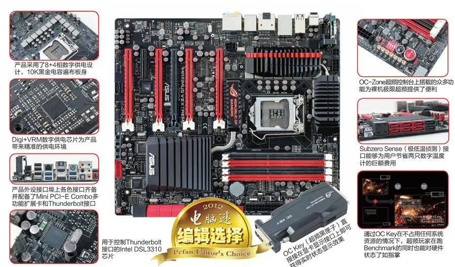 和此前测试的MAXIMUS Ⅴ FORMULA相比,MAXIMUS Ⅴ EXTREME在设计方面显得更大胆、更具超越性,它不但为用户提供了超高的硬件规格,同时也能大幅降低超频难度,为用户提供更快捷的状态侦测功能,甚至在超频成本方面也很好地为用户考虑到了。找准了定位并大胆采用突破性的创新设计,让MAXIMUS Ⅴ EXTREME在众多超频主板中显得尤其突出,成为了当之无愧的超频利器。《电脑迷》评测室也特别授予它编辑选择奖。