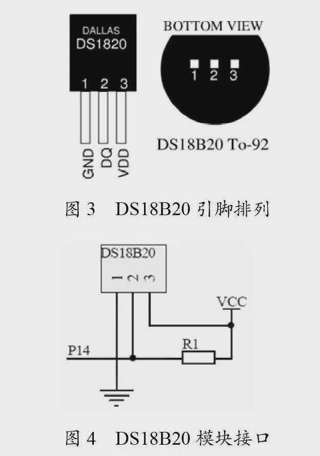 DS18B20外观和接口如图3和图4所示,它有3个引脚,1脚为GND电源地;2脚为DQ数字信号输入输出引脚,DS18B20通过1根数据总线与单片机进行双向通信;3脚为VDD外接供电电源输入端。