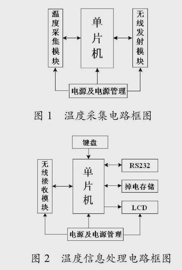 无线温度传感器的总体结构主要包括两部分:一是温度采集电路(图1),包括温度采集模块,单片机和无线发射模块,其作用是测量温度并将测量到的温度数据发射给主机;另外一部分是温度信息处理电路(图2),包括无线接收模块、LCD显示、掉电数据存储、按键和RS232接口,其作用是收集所有的温度信息,处理并显示出这些信息,同时还可以将这些数据传输到PC机上。