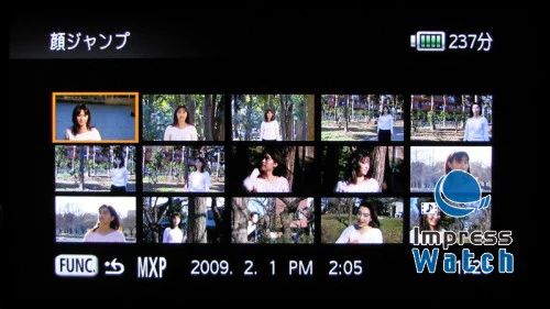 在播放功能方面也可以使用面部识别引擎,S10就支持这一功能。在使用「景色检索」中的「面部跳跃」功能后,会将所有出现脸的视频集中中一起。这个时候如果再按下「DISP」按键的话,就会激活「面部时间轴」功能。