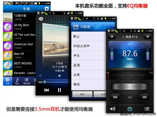最后是关于华为U8860的多媒体功能,首先在音乐方面本机默认的播放器支持专辑略缩图,和EQ均衡器,不过本机在不插耳机的状态下是无法调节EQ均衡器的,需要注意一下,大家也可以自己安装Android平台的更强大播放器,表现会更胜一筹。