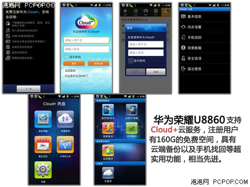 最后值得一提的是华为U8860还内置了部分云服务,用户免费注册用户之后就可以拥有160G云储存空间、在线同步电话本、远程定位手机、分享多媒体信息等等,还是非常值得尝试的一个新功能。