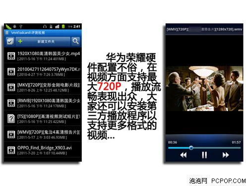依仗1.4GHz强大的处理器,华为荣耀可以轻松播放720P的高清视频,虽然这样的表现已经算是挺不错的,但是相比小米手机堆1080P的支持,U8860硬件方面的差距还是可见一斑。不过话又说回来了,两款死磕的手机都不支持HDMI,显得比较尴尬,1080P的视频在手机屏幕上也无法得到直观体验。