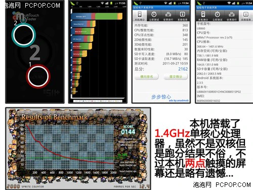 最后来看一下本机的跑分情况,在常用的《高级性能测试》中,华为U8860接近3000分高分,而第一款Tegra2双核手机Atrix 4G也就是3000多一点,看来这单核1.4GHz在跑分上还是很给力的。