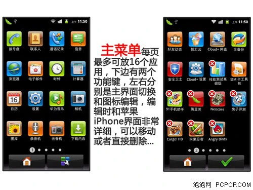 主菜单界面华为U8860并没有使用个原生的滚动样式,而是可以进行左右滑动,同时图标的位置也是可以更改的,后来安装上去的应用程序可以直接删图标进行删除,吸取了苹果iOS系统的一大优点。