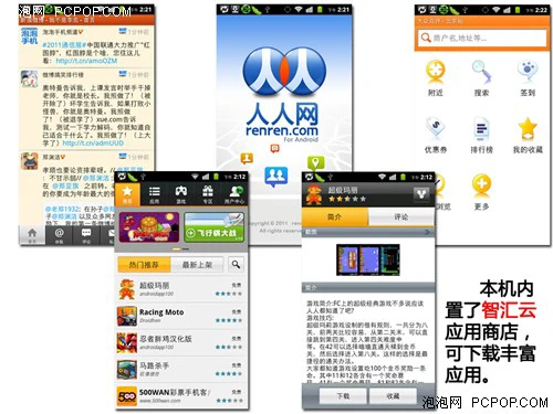 | 其他 | 3D加速配备前置摄像头 A-GPS 支持无线AP功能支持DLNA功能 SNS:人人网、开心网、新浪微博等大屏幕手机 |