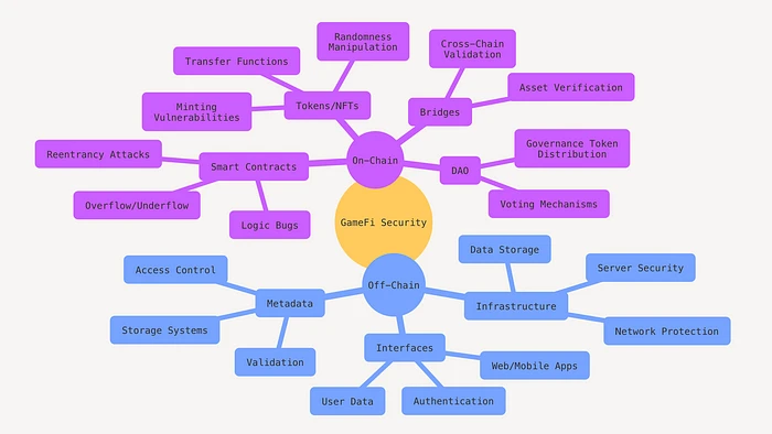 GameFi 的安全挑战分为 链上(与区块链相关)和 链下(外部基础设施)漏洞,每种漏洞都会给平台和玩家带来不同的风险。