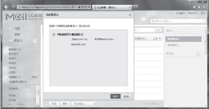 借助QQ邮箱可以满足这一要求:登录QQ邮箱,切换到“联系人”选项卡,如果你的主力邮箱并非QQ邮箱,那么需要通过“工具/导入其他邮箱联系人”命令提前完成导入的操作。单击右侧的“工具”按钮,从下拉菜单选择“合并联系人”,很快会显示合并对话框(如图),直接确认即可完成合并操作。