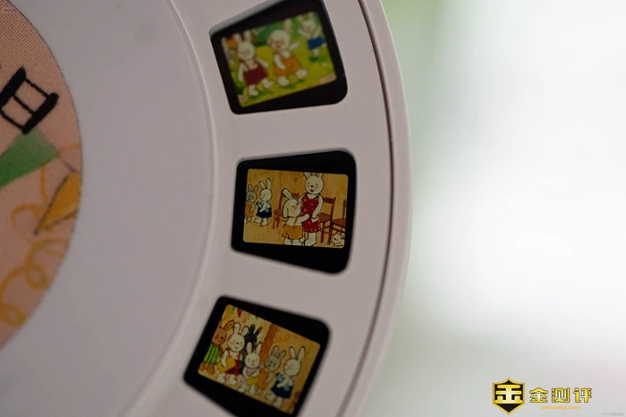 如果故事机正在播放,开盖就会自动暂停播放,非常安全。目前趣学伴提供的胶片有一百多种选择,拥有多达2520个场景,满足了我们早教的各种需求。不同于手机等设备,趣学伴的投影画面采用漫反射,没有频闪,而且非常柔和,很好的呵护了孩子的双眼。并且配合镜头上面的调焦旋钮,还能够根据不同的投屏距离调整清晰度,获得更好的观看效果。