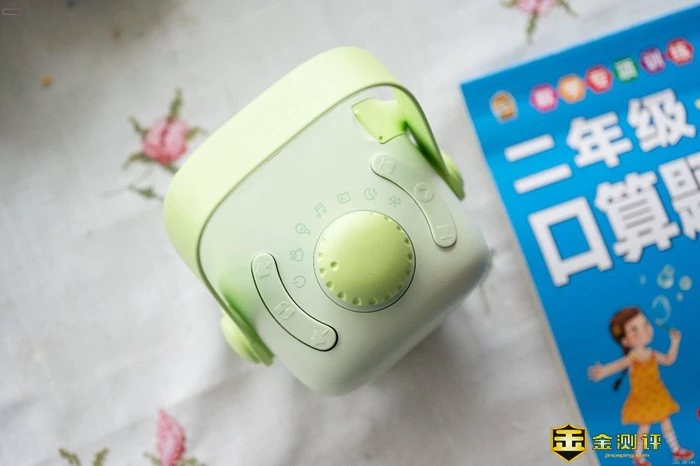 使用这款故事机只需要通过上面的物理按键就可以了,非常方便,操作方面,按键设计直观易懂。在机器的顶部就可用找到音量调节、播放暂停以及功能旋钮,孩子们可以轻松上手。在旋钮上面可以看到,这款故事机除了可以放映投影故事之外,还具有听书、音乐、配音等功能。