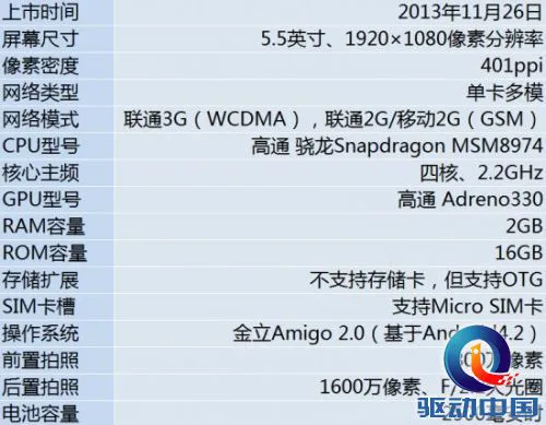 ELIFE E7作为金立手机的2013年度旗舰产品,在网络上拥有三种制式版本,内存上也拥有两种存储版本。笔者拿到的评测样机是WCDMA版,内存2GB RAM+16GB ROM,接下来先为大家简单展示下该机的基本信息:5.5英寸触控显示屏、1080P分辨率;高通骁龙800四核处理器、2GB RAM+16GB ROM;前置800万、后置1600万像素双摄像头;电池2500毫安时、内置不可拆卸;网络支持GSM+WCDMA单卡多模;系统运行Amigo 2.0,基于Android4.2的定制UI。