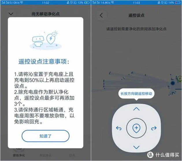 1、APP移动净化 - 遥控设点,注意请保持机器人置于充电底座上面、且电量50%以上再进行遥控设点;