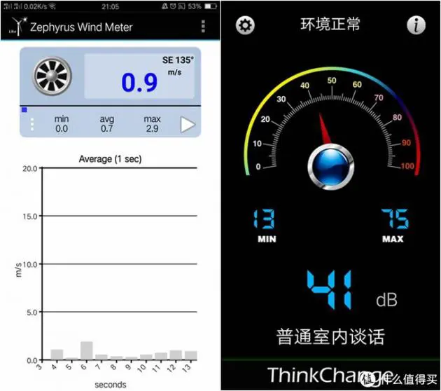 静音模式下的风速与噪声测试结果:出风口的平均风速大约1m/s,噪声控制在大约41dB。