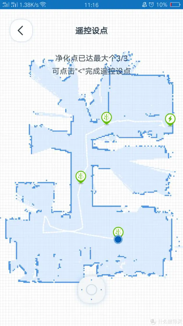 2、通过APP下面的方向按键进行操控机器人移动,抵达需要净化的位置以后点击中间的“+”号增加净化点,注意最多可增加4个净化点(含充电座);