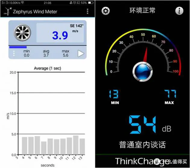 标准模式下的风速与噪声测试结果:出风口的平均风速大约3.7m/s,噪声控制在大约54dB。