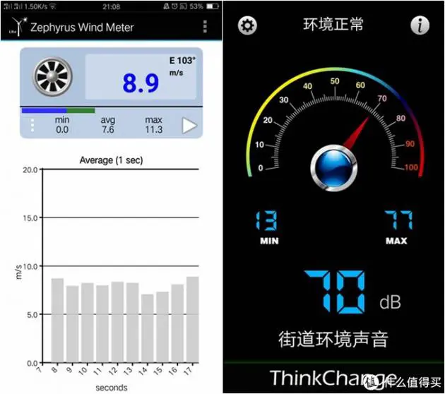 强劲模式下的风速与噪声测试结果:出风口的平均风速大约7.6m/s,噪声控制达到了70dB。