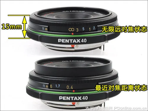 宾得DA 40mm F2.8 Limited的厚度在无限远对焦的情况下仅为15mm,最近对焦距离为0.4米,当对焦在最近对焦距离下镜头的伸出长度也比较小,造型十分像一块饼干或者说像一个蛋塔。