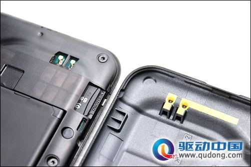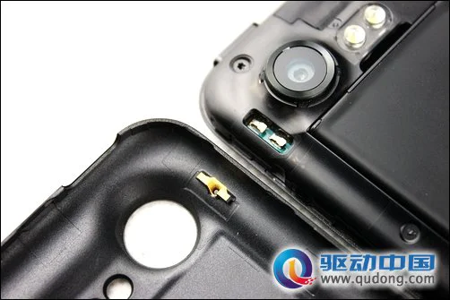 打开机身后盖后我们可以看到,惊艳S710e在内部的框架材质上采用了半透明式的设计,非常的具有科技时尚感,而我们这里需要介绍的特点则是惊艳S710e的外置天线是设计在后盖上的,我们可以看到在后盖的内侧有涂有黄色导电材料的过孔,然后可以对应连接到机身背部的触点,通过掩盖在后盖表面磨砂材质下的金属层来实现天线外接,这样的即可以防止我们的身体直接接触到天线,还可以最大化的将天线的屏蔽影响降到最低,从这一点在其他品牌产品上所没有的设计来看,HTC确实在终端的研发上具有相当深厚的功底。
