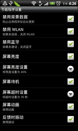 我们可以看到,尤其在节能设置方面,HTC专门设计优化不同情景模式下电池的消耗状态,这种与我们在原生平台中所采用的第三方软件譬如SetCPU之类在系统的稳定性以及节能的有效性上存在根本的区别。