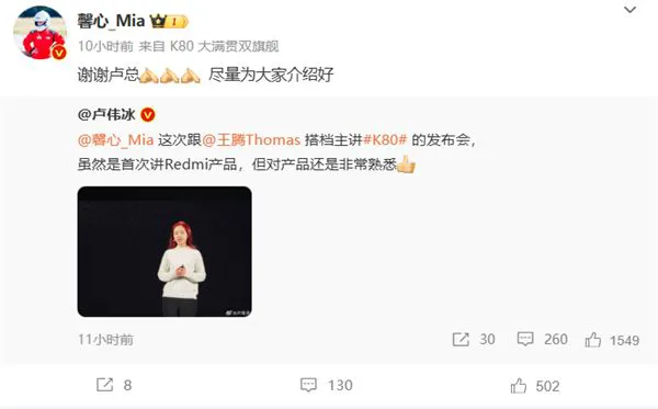 此次发布会将由REDMI产品经理胡馨心与REDMI品牌总经理王腾搭档主讲,这也是胡馨心首次讲REDMI产品。