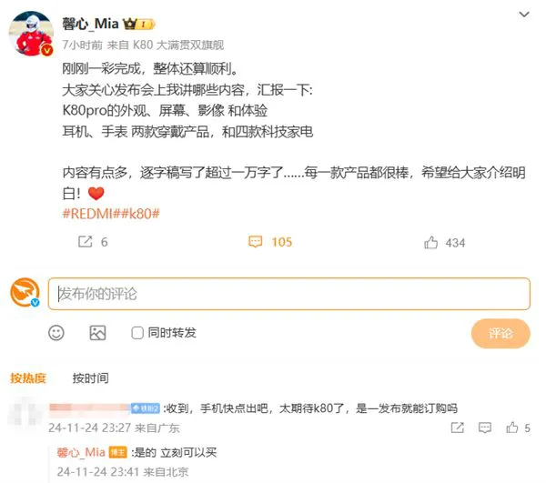 据胡馨心介绍,发布会上,她将讲解K80 Pro的外观、屏幕、影像和体验,以及耳机、手表两款穿戴产品和四款家电产品。