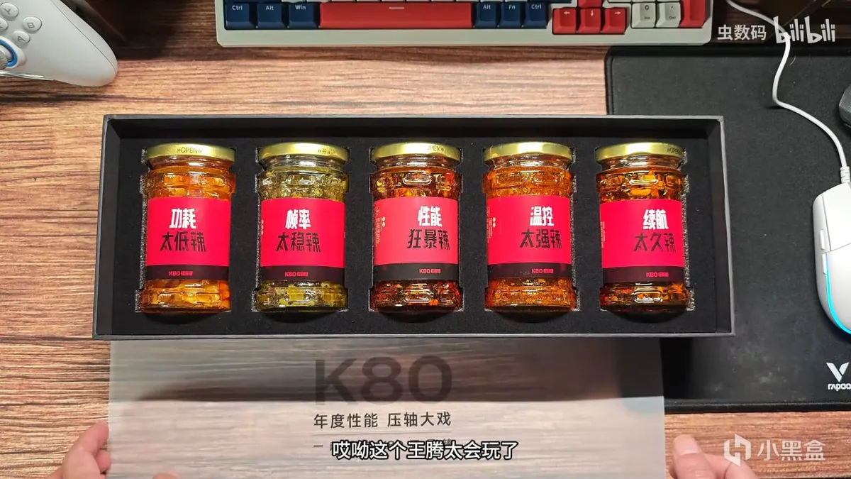 而在最近,不少媒体收到了K80的性能礼盒——打开一看,竟然是5瓶辣椒酱,分别写着“帧率太稳辣!”“功耗太低辣!”“性能狂暴辣!”“温控太强辣!”以及“续航太久辣!”