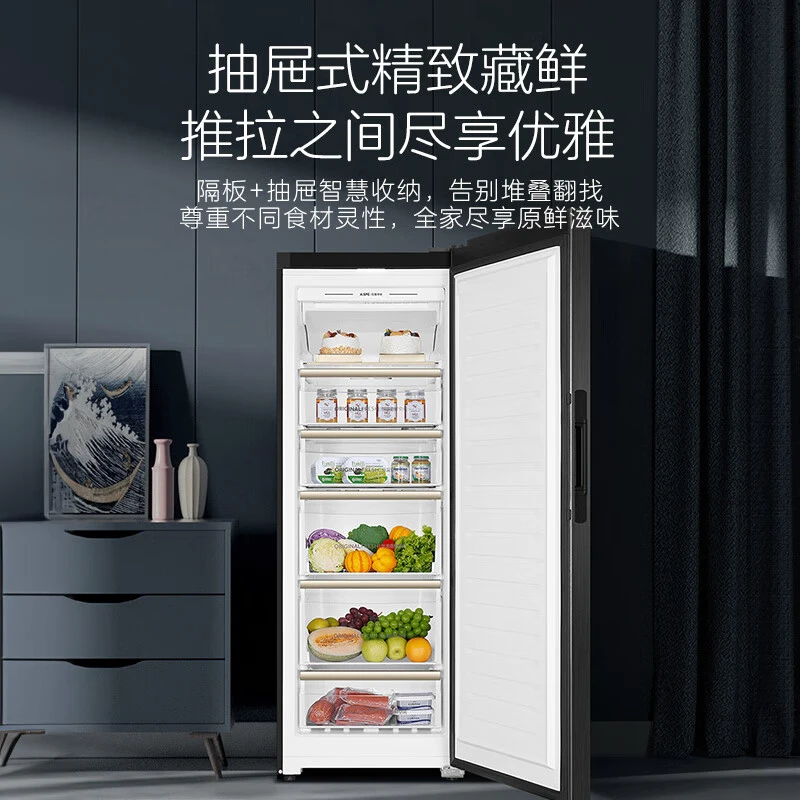 - 抽屉式设计,智能分层储藏,大容量227L却小占地,提供充足存储空间,尊重不同食材的存储需求。
