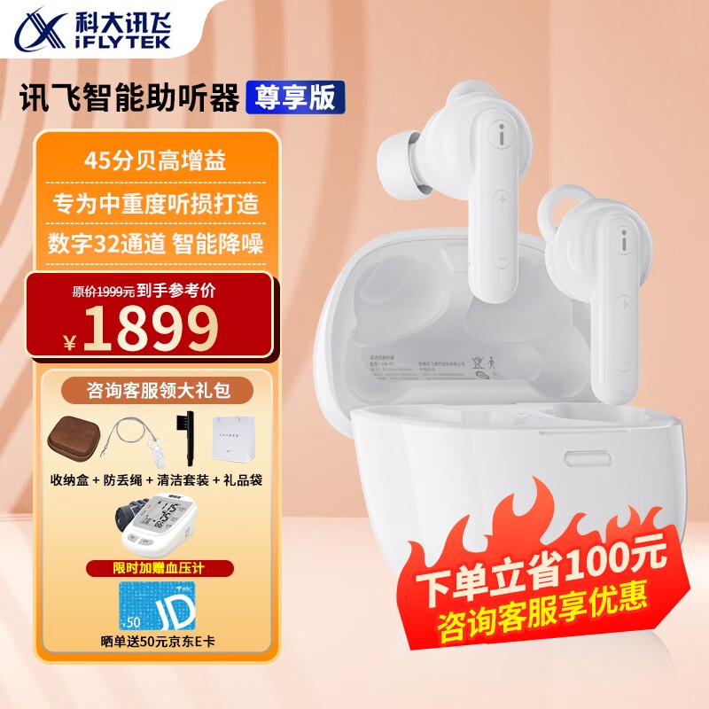 科大讯飞智能助听器老年人耳聋耳背无线入耳式 隐形充电耳机轻中度32通道双耳 降噪 【尊享版白】中重度听损|45db增益