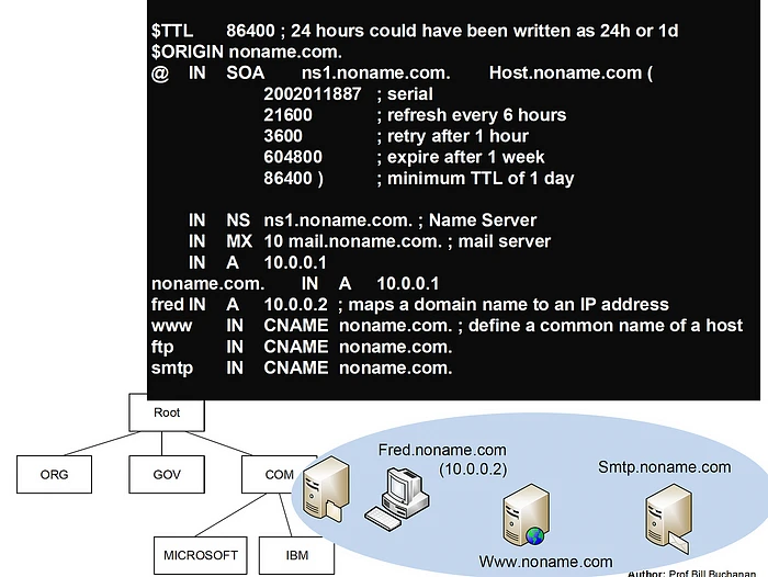 DNS 通过创建一个域名记录来工作,该记录定义了一个 SOA(授权起始)。然后,它定义了序列号、刷新时间等等: