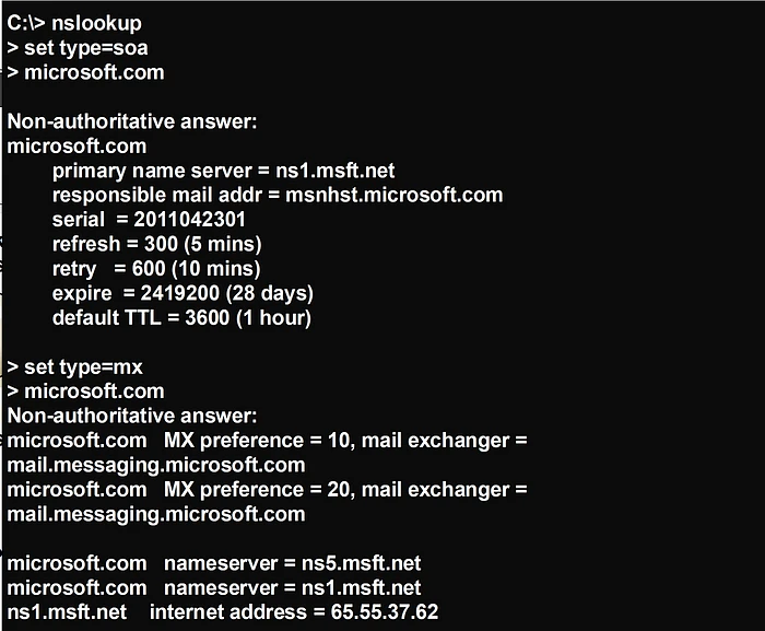 在此之中,我们可以定义一个 NS(名称服务器)和 MX(邮件服务器),以及域名中已定义主机的 IP 地址。我们可以使用 nslookup 来查询条目: