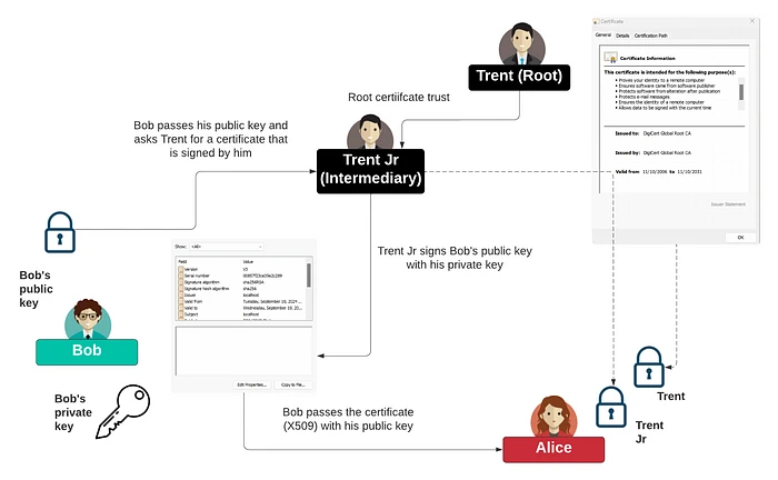 为此,我们有根 CA(证书颁发机构)和中间 CA。根 CA 具有允许中间 CA 在给定区域内对证书进行签名的信任,例如用于 TLS 连接、硬件设备和加密磁盘。然后,这些授权机构的公钥存储在计算机上,这是检查证书有效性所必需的。在这种情况下,Bob 让 Trent Jr 为他的公钥签名,然后 Bob 将带有他的公钥的签名证书传递给 Alice。然后,她使用 Trent Jr 的公钥检查这一点,如果验证通过,她就可以信任 Bob 的公钥。然后,他可以为他的身份进行数字签名: