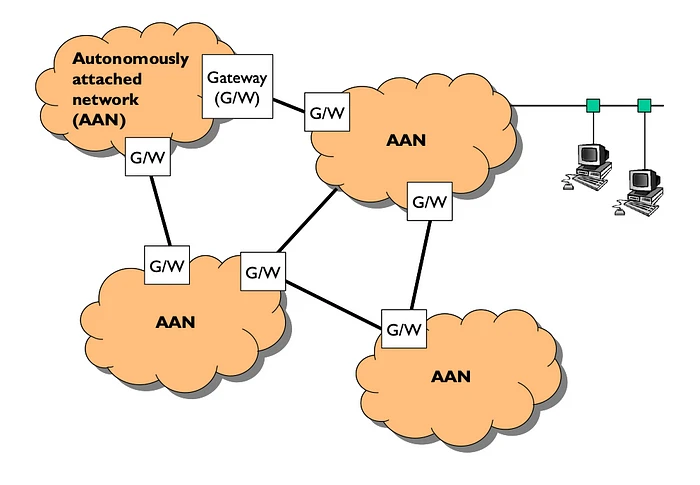 BGP 是对 EGP 的改进(BGP 的第四个版本被称为 BGP-4),并在 RFC1772 中定义。不幸的是,它比 EGP 更复杂,但不如 OSPF 复杂。BGP 假设互联网由任意互连的节点集组成。然后,它假设互联网连接到许多 AAN(自治连接网络),如图 3 所示,这些网络在组织、互联网服务提供商等周围创建边界。然后,它假设一旦它们进入 AAN,数据包将被正确路由。