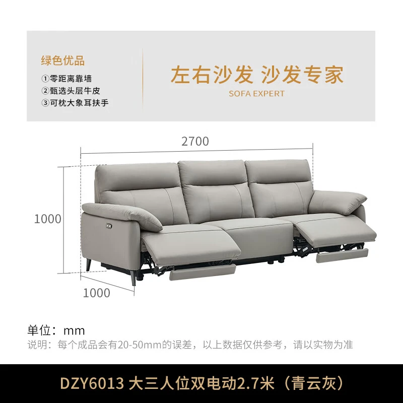 左右DZY6013S大三人位双电动真皮沙发,以其独特的设计和舒适的体验,成为居家必备良品。这款沙发采用头层牛皮材质,触感细腻,搭配高品质仿皮面料,整体质感升级。尺寸为980*440*1283mm,适合25-30m²的客厅空间。